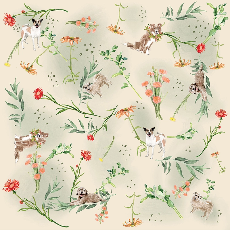 An illustrated dog pattern for BeBobi for their Countryside collection of dog travel accessories and products such as dog mats, beds etc. I was asked to create an illustration of 4 type of dogs, different leaves and flowers.